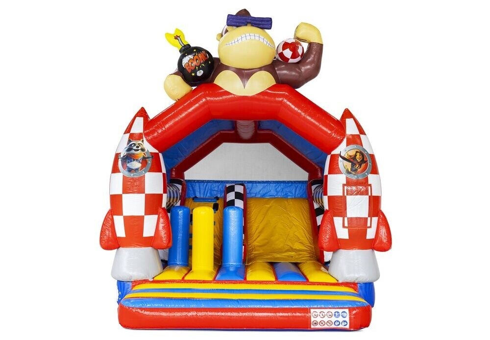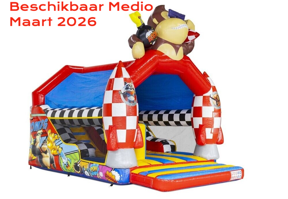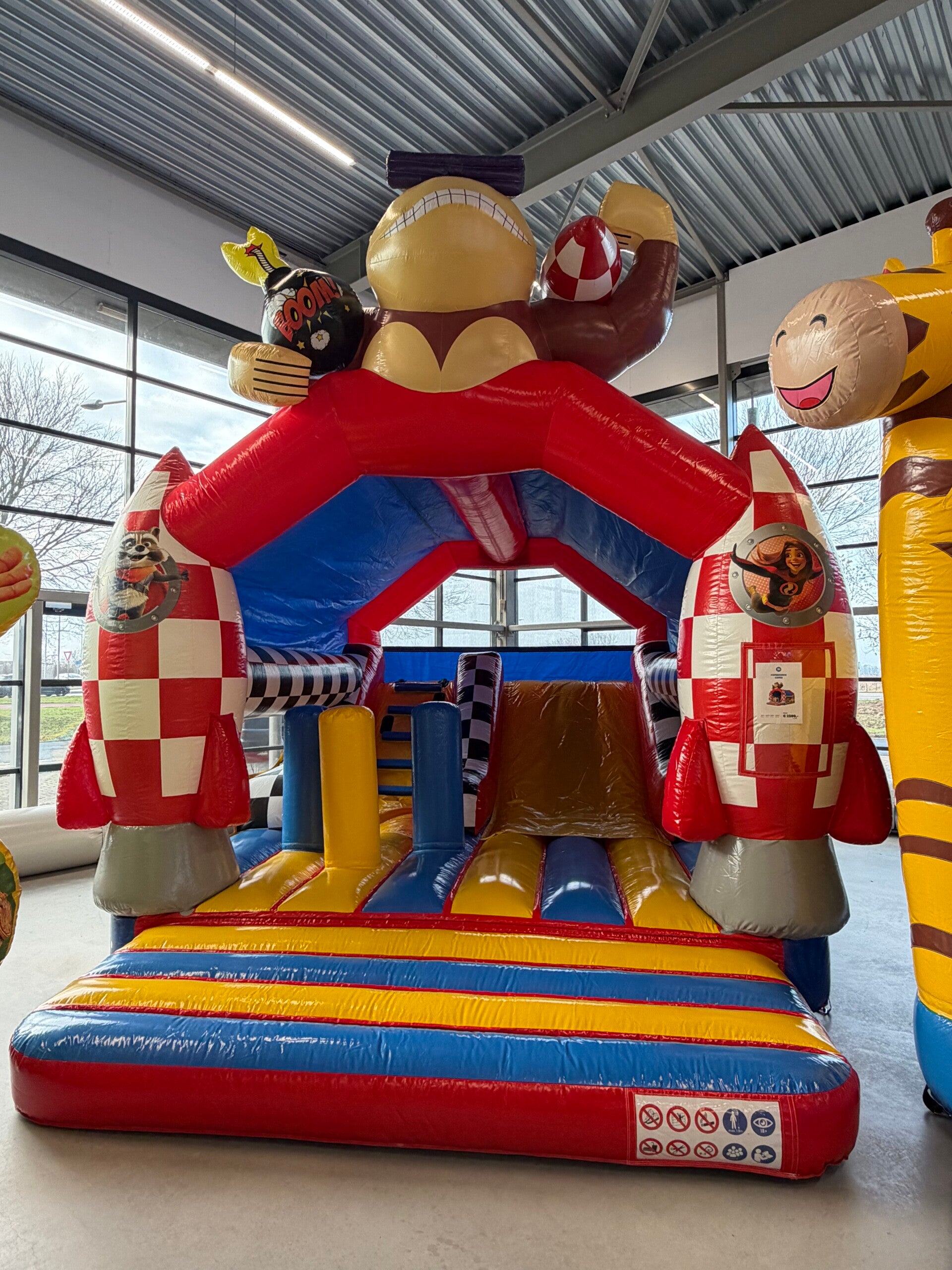 Met de kleurrijke Combounce Comic haal je een echte blikvanger in huis! Dit stoere springkussen comic barst van de energie dankzij de felle kleuren, speelse stripfiguren en het dynamische ontwerp met raketten en power-moves. Kinderen springen tussen de speelelementen door, duiken de overdekte ruimte in en roetsjen van de glijbaan. Het levendige springkussen strip thema geeft elk evenement een vrolijke, avontuurlijke sfeer waar kids meteen door worden aangetrokken.