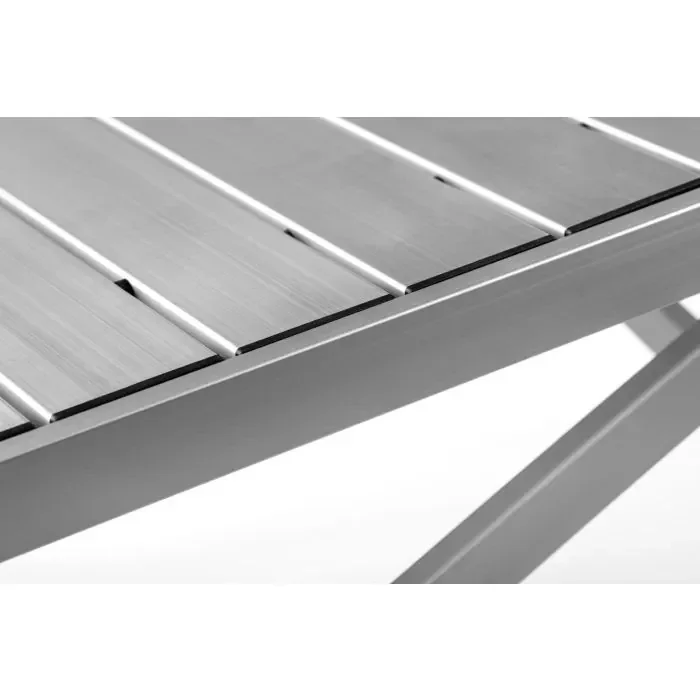 Het sterke aluminium frame is volledig inklapbaar, waardoor de tafel eenvoudig te vervoeren en compact op te bergen is. Het tafelblad bestaat uit weerbestendige aluminium lamellen, waardoor de tafel zowel binnen als buiten uitstekend presteert — zelfs bij intensief gebruik.